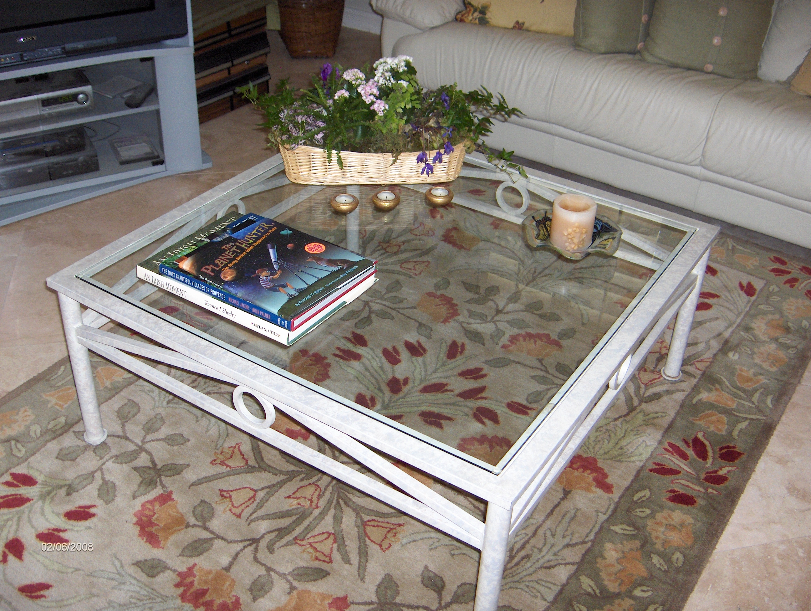 Coffee table, metal and glass, 42 in. X 42 in. X 16.5 in. tall, $150